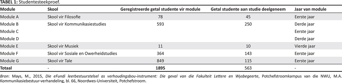 Die deelnemende studente was almal voltyds geregistreerde studente op die Potchefstroomkampus. Slegs studente wat die ‘lesing’ bygewoon het die dag waarop die vraelyste uitgedeel is, kon deelneem aan die vraelysopname. Die studente het dus deel uitgemaak van ’n beskikbaarheidsteekproef. Klasgroottes het verskil omdat van die modules wissel van die eerste tot die vierde jaar en daar dikwels meer studente vir ’n eerstejaarmodule geregistreer is as vir ’n vierdejaarmodule (Tabel 1).