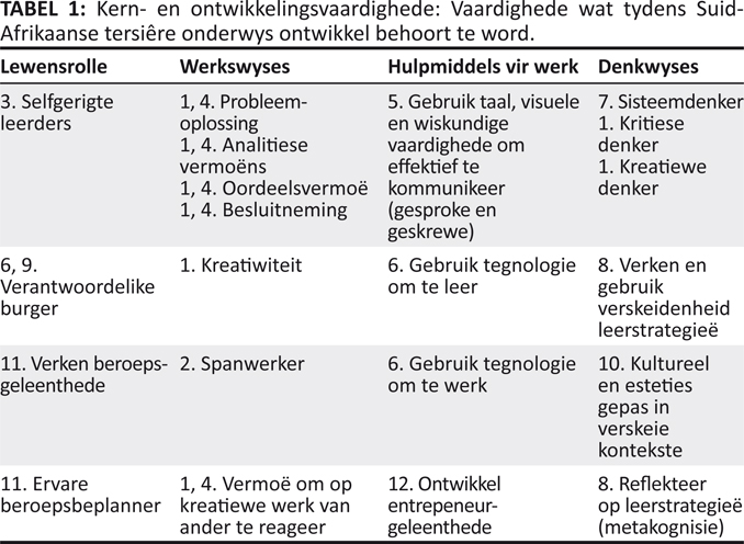 | TABEL 1: Kern- en ontwikkelingsvaardighede: Vaardighede wat tydens Suid-Afrikaanse tersiêre onderwys ontwikkel behoort te word. |