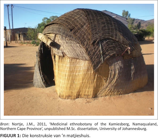 In Namakwaland kan die gelukkige reisiger vandag steeds sporadiese oorblyfsels van tradisionele matjieshuise sien (figuur 1). Van der Merwe (1945) gee ’n baie goeie beskrywing van die konstruksie van die matjieshuis. In die warm woestynklimaat van die Noord-Kaap is dit hitte, eerder as koue, wat vir inwoners die grootste uitdaging is. Verder was die Khoi-Sanmense van Suid-Afrika nomadies, en moes hulle huise dus saam met hulle kon trek. Die Khoi-San moes dus ’n huis ontwerp wat:
