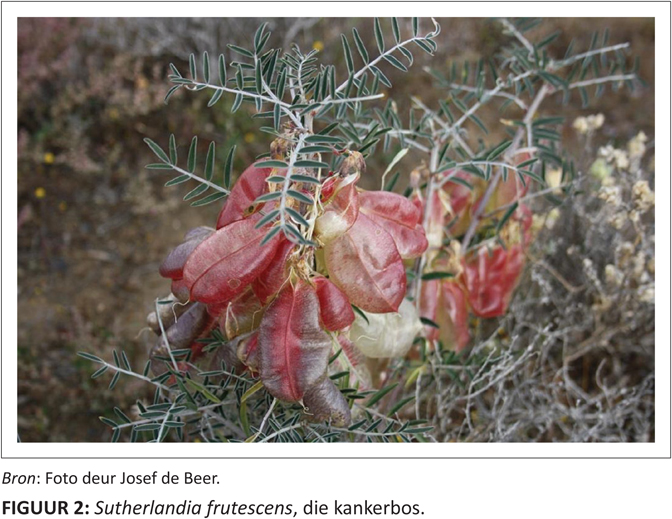 Dwarsdeur die wêreld maak die meeste gemeenskappe in landelike omgewings van plante vir medisinale doeleindes gebruik. De Beer (2012) het ’n etnobotaniese opname gemaak onder afstammelinge van die oorspronklike Khoi-San-mense in die Hantam (Calvinia-omgewing), met die medewerking van B-E. van Wyk (De Beer & Van Wyk 2011). Alhoewel die presiese afkoms (Nama, Griekwa of !Xam) nie bekend was nie, is daar wel vasgestel dat al die deelnemers in die studie van Khoi-Sanherkoms was. Daar is met ’n tradisionele geneser in die Hantam (Jan Baadjies), asook met 15 ander inwoners in die omgewing (Tabel 1) kontak gemaak. Gou het die navorsers agtergekom dat dié arm plaasarbeiders wat nie die hoë tariewe van mediese dienste kon bekostig nie, van selfbehandeling gebruik gemaak het. Deur mondelinge tradisie is dié kennis van geslag tot geslag oorgedra, maar as ’n lewende kennisbesit word hierdie kennis steeds voortdurend aangepas namate omstandighede verander. So byvoorbeeld is nuwe ‘bossiemedisyne’ geïdentifiseer toe MIV/VIGS sy tol begin eis het. ’n Tipiese eienskap van ’n selfgerigte leerder is naamlik om verantwoordelikheid te aanvaar vir eie leer en om eie inisiatief te gebruik om dit te verbeter. Dit is verbasend om te sien hoe die Westerse wetenskap vandag sommige van die inheemse kennisaansprake bevestig. ’n Klassieke voorbeeld hiervan is Sutherlandia frutescens, die kankerbos (ook bekend as die kalkoenbos) (figuur 2). Tradisioneel is Sutherlandia gebruik om nie net kanker te behandel nie, maar ook ander gesondheidsprobleme soos diabetes, hoë bloeddruk, nierstene, gal, maagprobleme en verkoues (De Beer 2012).