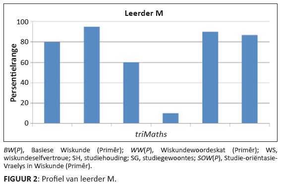Leerder M is ’n seun met Setswana as huistaal wat aan die begin van 2010 by die skool ingeskryf is. Hy ontvang onderrig deur medium van Engels. Hy het aanvanklik in wiskunde onderpresteer. Die onderwyser het doelbewus aandag aan die leerder se begrip van wiskunde gegee, waarna sy prestasie geleidelik verbeter het. Leerder M blyk toereikende kennis van die basiese wiskundevaardighede te hê en uitstekende kennis van wiskundewoordeskat. Die rou tellings van leerder M in die BW(P) is hoër as dié van 80% van die leerders in die normgroep en sy telling in die WW(P) beter as dié van 98% van die normgroep. Verder is leerder M se wiskundeselfvertroue beter as dié van 60%, sy studiegewoontes beter as dié van 90%, en sy totale studie-oriëntasie beter as dié van 85% van die leerders in die normgroep. Leerder M se ontoereikende houding teenoor wiskunde (beter as slegs 10% van dié van die leerders in die normgroep) kan in die toekoms (hoër grade) moontlik bydra tot ’n afname in sy wiskundeprestasie. Meer assessering kan dalk nodig wees, en onderhoude met die leerder en/of sy ouers of voogde sal moontlik nuttig wees om toepaslike intervensie te beplan en te implementeer.