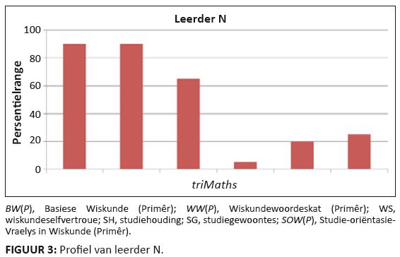 Leerder N het 9 uit 15 (60%) in die BW(P) en 9 uit 12 (75%) in die WW(P) behaal. Beide hierdie tellings is beter as dié van 90% van die leerders in die normgroep. Verder is haar tellings in wiskundeselfvertroue beter as dié van 65% van die leerders in die normgroep. Leerder N se ontoereikende tellings in studiehouding (SH), studiegewoontes (SG) en studie-oriëntasie in wiskunde (SOW[P]) is egter kommerwekkend. Sy het toereikend gepresteer in die BW(P) en WW(P), maar haar ontoereikende studie-oriëntasie het die potensiaal om haar toekomstige prestasie in wiskunde negatief te beïnvloed. Professionele aandag behoort hieraan gegee te word, soos die onderwyser ook aanbeveel het.