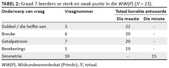 Graad 7-leerders se sterk en swak punte in die WW(P) (N = 23).