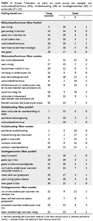 Ter aanvang word die leerders se resultate in die BW(P) en WW(P) in tabelvorm weergegee en kortliks verduidelik.Die leerders het ’n gemiddeld van 63% (9.6 uit 15) in die BW(P) behaal. Uit Tabel 1 blyk dit dat hulle in die BW(P) swak gepresteer het in dié vrae wat handel oor berekenings met breuke en aspekte van meting (minder as 6 leerders in die groep het hierdie vrae korrek beantwoord). Hierteenoor het leerders die beste gepresteer in die vrae wat oor temperatuur, afstand, datahantering, getalpatrone en berekenings met telgetalle gehandel het (19 leerders of meer uit die groep het hierdie vrae korrek geantwoord). Die leerders het gemiddeld 77.2% (9.3 uit 12) in die WW(P) behaal, en 15 van die 23 leerders in die studie het vol punte in die WW(P) behaal, wat baie goed is. Uit Tabel 2 blyk dit dat leerders die vrae oor die wiskundewoordeskat soos ‘dubbel’ of ‘die helfte van’, ‘breuke’, ‘getalpatrone’ en algemene bewerkings met ‘telgetalle’ meestal korrek geantwoord het. Die minste leerders wat ’n bepaalde vraag reg beantwoord het, was 15. Die betrokke vraag waarin hierdie swak prestasie behaal is, was vraag 10 wat oor ‘simmetrie’ gehandel het. Vervolgens word die leerders se response in die SOW(P) in tabelvorm weergegee en kortliks verduidelik. Leerders moes by elke stelling ’n keuse uit die response ‘amper altyd’, ‘soms’ of ‘amper nooit’ maak. Die respons ‘soms’ is as onseker geïnterpreteer. In die algemeen het deelnemers aan die studie ‘soms’ as hul respons op die stellings in die vraelys gemerk, wat moontlik daarop kan dui dat hulle onseker is oor bepaalde aspekte van hul eie studie-oriëntasie. Veertien en meer leerders in die groep het ‘soms’ gemerk by items wat handel oor hul eie liefde vir wiskunde, hulp aan klasmaats in wiskunde, oortuiging dat hulle self wiskunde kan doen, wiskunde as ’n uitputtende aktiwiteit vir hulle en die gee van aandag. By wiskundeselfvertroue (WS, 17 stellings; Tabel 3) het leerders positiewe response gegee by stellings wat verband hou met goeie leesvermoë, aandag gee, wiskundeselfvertroue en die herhaalde lees van ’n som. Response rakende hul werkspoed, die moeilikheidsgraad van wiskunde, tekort aan selfvertroue om vrae te vra en onbekende wiskundewoorde was in die algemeen onseker tot negatief. By die studiehouding in wiskunde (SH, 8 stellings; Tabel 3) was die response van tussen 16 en 18 leerders positief rakende wiskundeselfvertroue en hul leeromgewing. Die response ten opsigte van die twee stellings in verband met hulpverlening aan klasmaats en studiehouding was egter onseker (in dié gevalle ‘soms’). By die oorblywende vier stellings het response gewissel tussen ‘amper altyd’ en ‘soms’. Uit Tabel 3 blyk dit verder dat leerders positiewe response gegee het op die stellings oor studiegewoontes (SG, 11 stellings) rakende goeie sig en gehoor in die klas, deelname aan groepwerk, voltooiing van toetse en huislike omstandighede, terwyl die response op die ander ses stellings, insluitend die doen van verbeteringe, gewissel het tussen ‘amper altyd’, ‘soms’ en ‘amper nooit’.