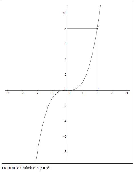 Ek het opgemerk dat die studente en onderwysers senuagtig en onseker begin lag het en nie meer wou waag met die probleme wat gevolg het, om ’n antwoord te gee of te verduidelik waarom hulle ’n ja of ’n nee gekies het nie. Van die leerders wou glad nie meer in die groot groep ’n mening opper nie. ’n Duidelike vertwyfeling in hul eie vermoëns, of dan die konsepte wat hulle gevorm het, het ontstaan. Ook in hierdie geval is ’n konsepbeeld gevorm wat nie aan ’n konsepdefinisie genetwerk is nie. Prosedurele kennis in plaas van konseptuele kennis is gevorm. Die klakkelose toepassing van algoritmes geniet voorrang bo heuristiek, wat kennisbou deur middel van betekenisgewing ondersteun. Die toepassing van algoritmes het die gevaar dat konvergente denke van leerders in hoofsaak ontwikkel word. Juis daarom het ek hierdie probleem deel van die ondersoek gemaak met die doel om ook die divergente denke van studente en onderwysers te prikkel.Bewering 3: As x3 = 8, dan is x = 2 die enigste oplossing Ek het besluit om die proses om te keer deur onmiddellik met die skets van die grafiek van y = x3 te begin.