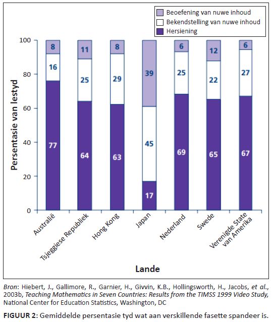 Die leerders in Amerikaanse skole se prestasie was van só ’n aard dat hulle ook nie die probleme in die twee hoogste kognitiewe TIMSS-vlakke kon bemeester nie. Dit het tot die 1995-TIMSS en 1999-TIMSS-videostudies gelei. Die doel van hierdie videostudies was om die probleem in onderrig in die VSA te ondersoek. Dit het dus die onderrigpraktyke in graad 8-klaskamers van verskillende toplande soos Japan en Nederland ontleed en met dié van die VSA vergelyk. Suid-Afrika kan ook baat by hierdie studie aangesien dit lig gewerp het op die onderrigpraktyke van die bes presterende lande. Drie lande, naamlik Duitsland, Japan en die VSA, het aan die eerste 1995-TIMSS-videostudie deelgeneem terwyl die tweede 1999-TIMSS-videostudie sewe lande ingesluit het, naamlik Australië, die Tsjeggiese Republiek, Hongkong, Japan, Nederland, Switserland en die VSA. In die tweede videostudie word die video’s van 638 graad 8-wiskundelesse van die verskillende lande ontleed. Die verslag ‘Highlights from the TIMSS 1999 Video Study of Eighth-Grade Mathematics Teaching’ wat deur Hiebert, Gallimore, Garnier, Givvin, Hollingsworth, Jacobs, Chiu, Wearne, Smith, Kersting, Manaster, Tseng, Etterbeek, Manaster, Gonzales en Stigler (2003a) saamgestel is, wys betekenisvolle ooreenkomste en verskille in die onderrig van wiskunde in die spesifieke lande uit. So byvoorbeeld praat al die deelnemende lande se onderwysers baie meer as die leerders in die klas. Daar is ook betekenisvolle verskille in die onderwyspraktyke van die deelnemende lande. Hiebert et al. (2003a) verduidelik dat swakker presterende lande soos die VSA en die Tsjeggiese Republiek se wiskundelesse meer klem plaas op die hersiening van die vorige werk, terwyl Japan wat beter presteer het, meer klem plaas op die ontwikkeling van nuwe begrippe. In die 1999-TIMSS-videostudieverslag word die gemiddelde persentasie van die tyd wat in die verskillende lande aan verskillende fasette van graad 8-wiskundelesse gewy is, duidelik aangedui (sien Figuur 2). In ’n klas waar meer tyd aan hersiening en die aanbring van korreksies van die vorige dag se werk gewy word as aan die ontwikkeling van nuwe begrippe, is daar nie genoeg tyd vir die bemeestering van die nuwe werk nie. Figuur 2 toon aan dat 60% van die klastyd in Japan aan die bekendstelling van ‘nuwe’ werk bestee word en ’n verdere 16% om hierdie nuwe werk in te oefen. Daarteenoor wy die Amerikaanse onderwysers meer as die helfte van die tyd aan die hersiening van vorige werk.