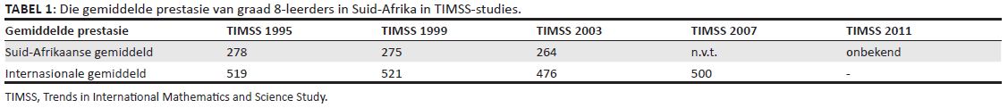 Suid-Afrika het nie aan die 2007-TIMSS-studie deelgeneem nie maar wel aan die 2011-TIMSS-studie. Die resultate hiervan is nog nie vrygestel nie. Reddy, Kanjee, Diedericksen en Winnaar het in 2006 die graad 8-uitslae van die 2003-TIMSS-studie ontleed en in ’n RGN-verslag bekend gemaak. Nog ’n rede waarom hierdie artikel juis die TIMSS-studie gebruik, is omdat dit nie slegs op die inhoud van die kurrikulum fokus nie, maar ook op die wiskundige denkvlakke (kognitiewe prosesse) wat inpas by die teoretiese raamwerk van die artikel. Suid-Afrika se uitslae het volgens Reddy et al. (2006) nie baie oor die jare (1995–2003) verander nie (sien Tabel 1). Alhoewel die 2003-TIMSS-data verouderd mag wees, is dit die mees relevante data tans beskikbaar wat ’n groot verteenwoordige steekproef hoërskoolleerders se wiskundeprestasies met dié van ander lande se leerders vergelyk.