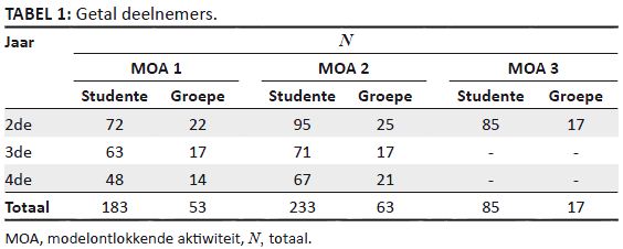 Wiskundige modellering word ingesluit as ’n onderwerp in die wiskundeonderwysmodule vir grondslagfase-onderwysstudente in hul tweede, derde en vierde jaar. Die deelnemers aan die studie was dus 501 voornemende onderwysers in genoemde groepe oor twee opeenvolgende jare (Tabel 1). Die meeste van die voornemende onderwysers was gewoond aan tradisionele, kunsmatige woordprobleme uit skoolhandboeke en is nie voorheen, gedurende hul skoolopleiding, blootgestel aan komplekse, ryk, oop take in wiskunde nie. Die MOA’s is gedurende drie tot vier klasperiodes van 50 minute elk deur groepe van twee tot ses studente opgelos. Tydens die eerste twee jaar van die studie het al drie jaargroepe studenteonderwysers dieselfde MOA’s op verskillende tye gedurende die jaar opgelos. In die derde jaar van die longitudinale studie het die jaargroepe verskillende MOA’s voltooi en tydens die skryf van hierdie manuskrip was die ontleding van die oplossings vir die MOA’s van die derde- en vierdejaars nog nie afgehandel nie, dus word slegs die resultate van die tweedejaars vir MOA 3 hier gerapporteer (Tabel 1). Groepe moes al hul berekeninge vir die taak, hul finale modelle en ’n gedetailleerde beskrywing van die proses wat hulle gevolg het, inhandig. Elke groep het die geleentheid gekry om hul oplossingstrategieë en modelleringproses in ’n aanbieding voor drie of vier ander groepe studente te verduidelik, waarna die verskillende oplossingstrategieë bespreek is. In die laaste fase van die onderrigeenheid oor modellering moes elke groep studente twee MOA’s vir kleiner kinders (ouderdomme ses tot nege) skep. Verslag oor hierdie laaste kreatiewe fase van die onderrigeenheid word in ’n ander artikel gelewer en sal dus nie hier bespreek word nie.