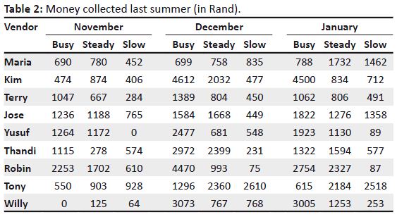 During the last summer holidays Maya started a concession business at Wild Days Amusement Park. Her vendors roam the park with popcorn and drinks for sale. Maya needs help deciding whom to rehire next summer.Last year Maya had nine vendors. This summer, she is only able to employ six – three full-time and three half-time. She wants to rehire only the most successful vendors, but she doesn’t know how to compare them because of unequal shift lengths. Also, when they worked, makes a big difference. After all, sales would peak on a crowded Friday night and dip on a rainy afternoon. Maya reviewed her records from last year. For each individual vendor, she totalled the number of working hours and the money collected – when business in the park was good (high attendance), steady, and slow (low attendance) (see Table 1 and Table 2). Please evaluate how well the various vendors did for the business last year and choose three she should rehire full-time, and three half-time. Write a letter to Maya giving your results. In your letter describe how you evaluated the vendors. Give details so Maya can check your work; do give a clear explanation so she can decide whether your method is efficient.
