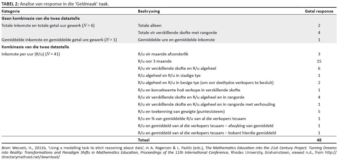 Die kategorisering van antwoorde toon duidelik verskillende vlakke van vlotheid, soepelheid, nuutheid, en bruikbaarheid (Tabel 2). Twee groepe se response word bespreek. Groep 1 het die totale inkomste en totale getal werksure apart bereken, maar die twee datastelle nie gekombineer nie. Hulle het dus ’n minder gesofistikeerde model (soepelheid) geskep en het nie van benadering of rigting gedurende die oplossingsproses verander nie. Hulle het hul oplossings nie krities geëvalueer nie en dus by hul oorspronklike idee gehou (vlotheid) wat gelei het tot ’n minder oorsponklike (nuutheid) en minder nuttige model (bruikbaarheid). Groep 1 se model toon dus konsekwent laer vlakke van kreatiwiteit, gemeet aan al vier kriteria in die raamwerk.