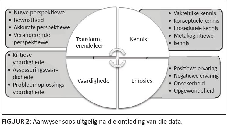 Die navorser het beoog dat hierdie leergebeure meer as net die uitvoer van ’n opdrag moes wees. Die student moes aktief betrokke raak in konkrete aktiwiteite en daaroor reflekteer oor hoe om die leer van Natuurwetenskappe te transformeer. Die konkrete en die emosionele ervaring het reeds in die klaskamer begin waar die studente ingelig is oor hoe die projekte geassesseer sou word. Soos reeds genoem, is die vier hoofaanwysers die konstruering van kennis, emosies, vaardighede en transformerende leer. ’n Grafiese voorstelling van die ontleding van bevindinge word voorgestel