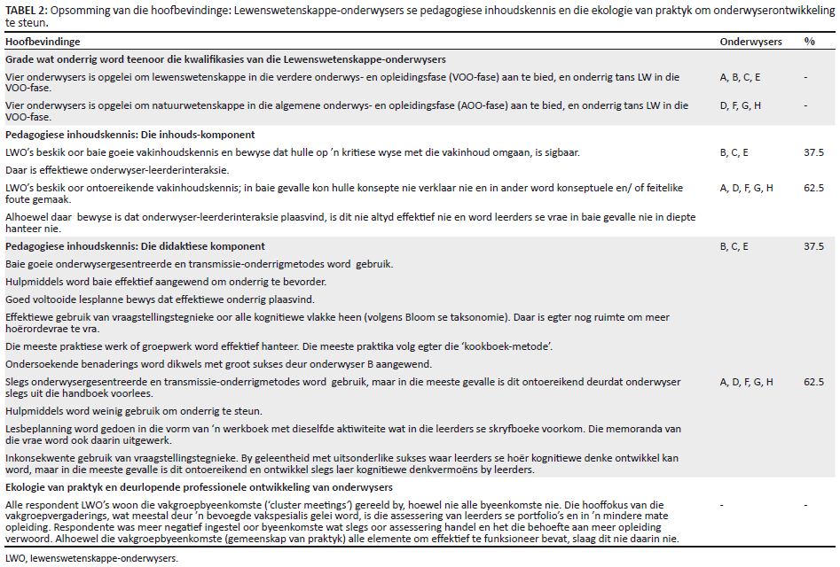 Uit Tabel 3 kan afgelei word dat pedagogiese inhoudskennis van die LWO’s wat aan die navorsing deelgeneem het in twee hoofkategorieë val, naamlik dié