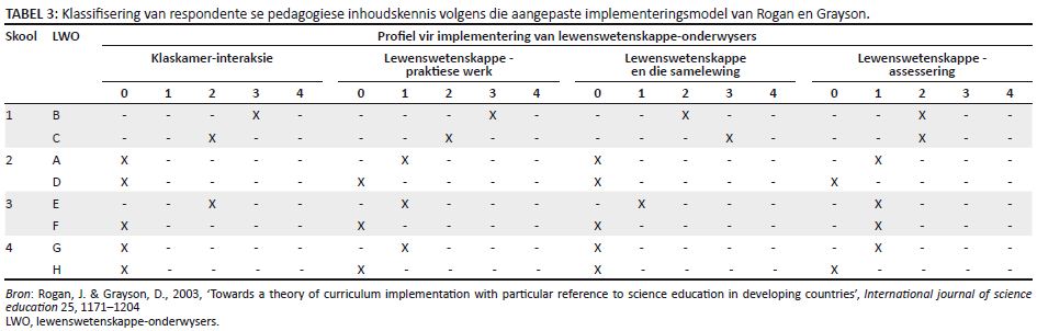 Klassifisering van respondente se pedagogiese inhoudskennis volgens die aangepaste implementeringsmodel van Rogan en Grayson.