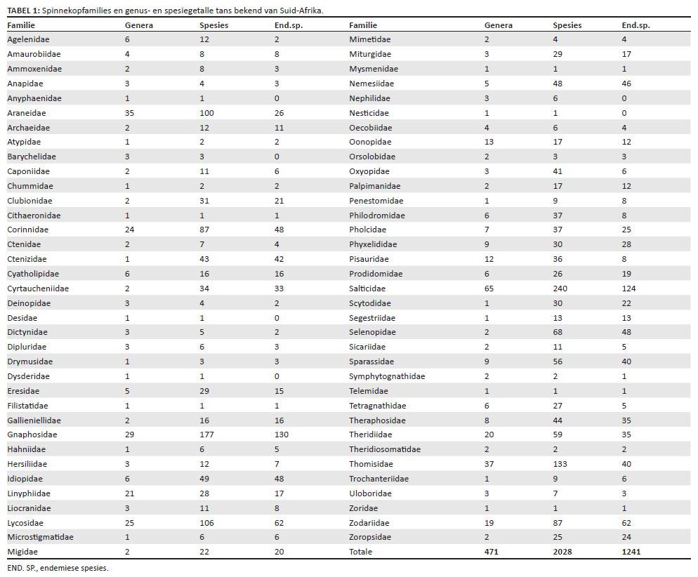 TABEL 1: Spinnekopfamilies en genus- en spesiegetalle tans bekend van Suid-Afrika.