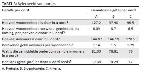 • algemene inligting. Die afdelings kan nie klinies geskei word nie, aangesien van die items waarskynlik in meer as een kategorie geplaas kan word. Die data word weergegee soos dit van die eerste groep, trustees en bestuurders (Navorsingsvraelys en resultate vir trustees en bestuurders), en van die tweede groep, inwoners (Navorsingsvraelys en resultate vir inwoners) ingewin is. Die tweede groep het die vraelyste tydens gestruktureerde sessies, met voorligting, voltooi. Die data wat van die agt deelnemende oorde in Pretoria ingewin is, is gereduseer tot rekenkundige gemiddeldes en, waar toepaslik, in voorkeurvolgorde gerangskik as groep A. Die vergelykende uitkoms van die opnames in Bloemfontein en op Knysna word onderskeidelik as groep B en groep C getoon. Die uitkoms toon dieselfde patroon in die resultate, wat verder gesamentlik verwerkbaar is, maar nie getoon word nie. Weens die beperkte opnamegeleenthede wat Knysna gebied het, is die berekende gemiddeldes skerper as elders.