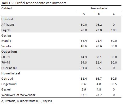 Tabel 5 tot Tabel 8 verskaf die inwoners se profiel, algemene en uitgebreide gesondheidsorg diensvoorkeure asook fasiliteite - en diensvoorkeure.