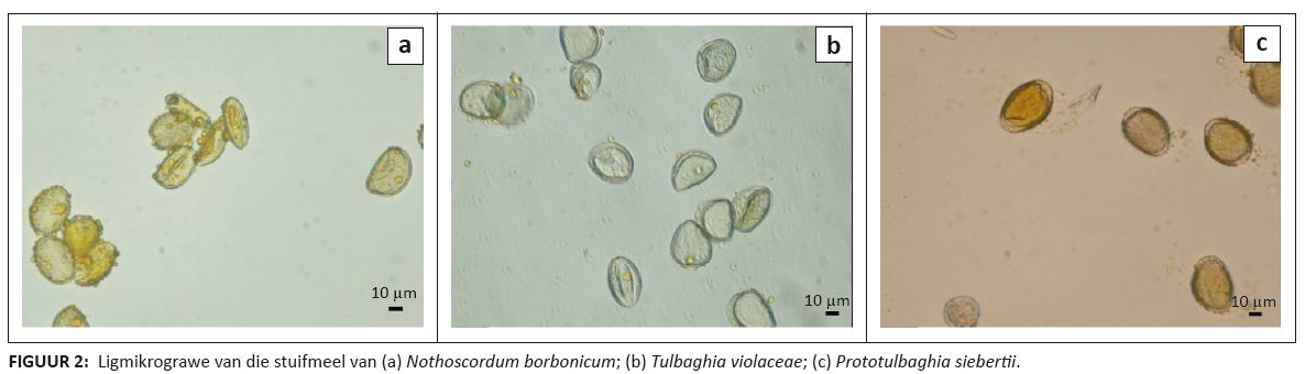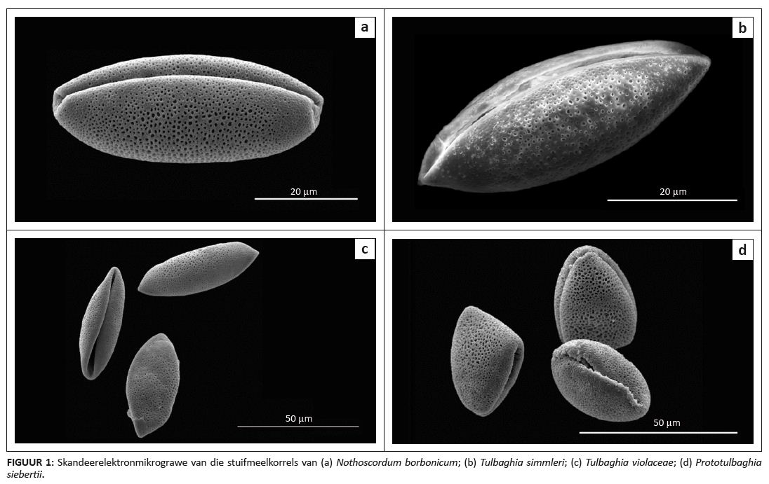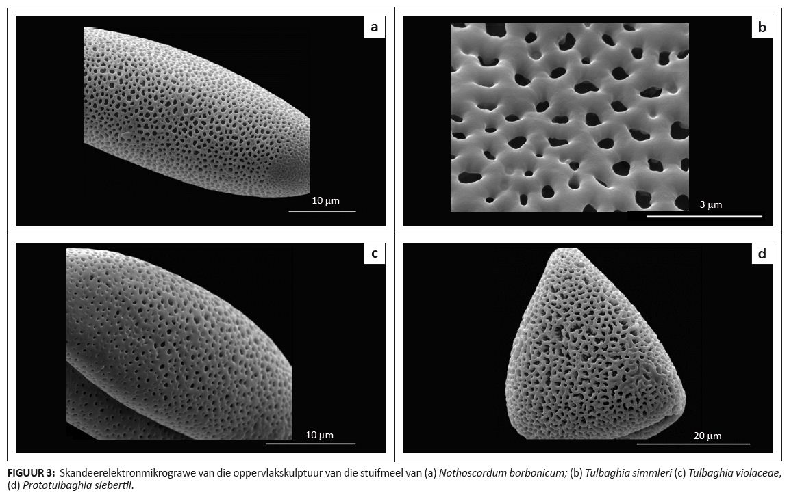 Die stuifmeelkorrels van N. borbonicum, T. simmleri, T. violaceae en P. siebertii is eenders en vertoon perprolaat en monosulkaat, terwyl die oppervlakskulptuur geretikuleer en heterobrogaat is. Die beskrywings van hierdie spesies se stuifmeelkorrels stem ooreen met die beskrywings vir die Allium-spesies wat deur Güler & Pehlivan (2006) en
