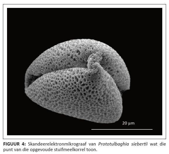 Namin et al. (2009) gedoen is, asook die beskrywings van die agt spesies wat deur Schulze (1980) ondersoek is. Die stuifmeelkorrels in hierdie studie is egter langer (42 µm – 65 µm) as die korrels wat deur Schulze (1980) vir Allium (30 µm – 45 µm) beskryf is. Die stuifmeelkorrels van P. siebertii vertoon in beide die SEM- en die LM- ondersoeke asof dit in die breedte gevou is en asof die punte van die opgevoude stuifmeelkorrels bymekaarkom om sodoende die voorkoms van ’n driehoekige, disulkate stuifmeelkorrel te gee. Dit is ongewoon, aangesien monosulkate stuifmeelkorrels in die lengte vou (Katifori et al. 2010). Twee hipoteses kan geformuleer word om hierdie verskynsel te verklaar. Die eerste hipotese is dat die vou teweeggebring word deur harmomegatie. Harmomegatie is die vouing van stuifmeelkorrels om die afname in sellulêre volume as gevolg van waterverlies te akkommodeer en sodoende die uitdroging van sellulêre materiaal te verhoed (Halbritter & Hesse 2004; Katifori et al. 2010). Tydens dehidrasie verleng die opening in die stuifmeelwand, die stuifmeelwand vou in sodat die rande van die opening na mekaar beweeg en die opening verseël word. By die vouing van monosulkate stuifmeelkorrels maak die wand van die opening skerp voue voordat dit in die korrel oorloop, terwyl die res van die stuifmeelwand geleidelik na ’n spoelvorm oorrol (Katifori et al. 2010). By P. siebertii wil dit voorkom asof hierdie proses nie plaasvind nie, maar dat die korrel toespring sodat die verste punte aan mekaar raak. Dit sal beteken dat die sellulêre materiaal nie binne die stuifmeelkorrel verseël word nie en aan uitdroging blootgestel bly. Die ontwikkelingsproses van stuifmeelkorrels verloop deur vyf fases, naamlik: (1) mikrosporogenese: wanneer die stuifmeelkorrel binne die helmknop ontwikkel en deur lokulêre vloeistof omring word; (2) dehidrasie: wanneer die lokulêre vloeistof weer deur die omringende blomorgane geabsorbeer word, of verdamp voordat die helmknop oopmaak en die stuifmeelkorrels dehidreer; (3) aanbieding: wanneer die helmknop oopmaak en die stuifmeelkorrels vrygestel word; (4) verspreiding: wanneer stuifmeelkorrels deur agente versprei word terwyl dit aan omgewingsfaktore, soos byvoorbeeld sonlig, blootgestel is; en (5) stuifmeel-stempel-interaksie: wanneer stuifmeelkorrels op ’n verenigbare stempel beland en die korrel, indien die toestande gunstig is, rehidreer en ontkiem (Firon et al. 2012). Harmomegatie en die gevolglike vouing van P. siebertii se stuifmeelkorrels, sal dus tydens die fase van dehidrasie plaasvind en die vermoede is dat die korrels dan tydens die fase van stuifmeel-stempel-interaksie weer sal ontvou. ’n Tweede hipotese is dat die stuifmeelkorrels van Prototulbaghia siebertii in die gevoude vorm ontwikkel en groei, en eers ontvou wanneer dit gereed is om te ontkiem en in aanraking met ’n geskikte stempel kom. Dié hipotese kan moontlik verklaar waarom die punte van sommige van die gevoude korrels lyk asof hulle vergroei is. Hierdie hipoteses gee nog nie bevredigende antwoorde op die vraag waarom die vouing by die stuifmeelkorrels plaasvind nie; en dit wys ook nie die faktore uit wat veroorsaak dat die korrels vou of ontvou nie. Dit laat wel die vraag ontstaan of hierdie spesie nie dalk anders aangepas is by die omgewing as die ander spesies in die Alliaceae-familie nie – veral wanneer die spesie se beperkte verspreiding (Vosa 2007) in ag geneem word. Die manier waarop ’n stuifmeelkorrel vou, kan ook uniek aan ’n sekere taksonomiese groep wees en gevolglik as ’n taksonomiese kenmerk gebruik word (Halbitter & Hesse 2004). Dit is dus van belang om hierdie unieke verskynsel van die vouing van P. siebertii se stuifmeelkorrel verder te ondersoek en die moontlike evolusionêre belang daarvan te bepaal.