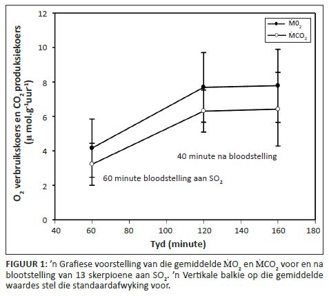 Die bevinding dat die ṀO2- en ṀCO2-waardes ná SO2-blootstelling verhoog, is by elk van die 13 skerpioene waargeneem.