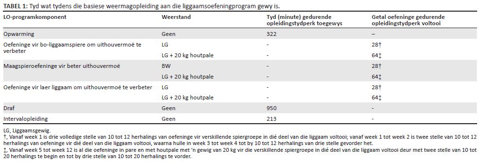 Die weermagrekrute het die basiese standaardprogram vir weermagopleiding oor ’n tydperk van 20 weke voltooi. Dié program, gebaseer op die American College of Sports Medicine’s Guidelines for Exercise Testing and Prescription, het bestaan uit strawwe oefeninge van meer as ses metaboliese ekwivalente (MET’e) waaraan die rekrute twee uur daagliks deelgeneem het vir die duur van die 20 weke waartydens die studie onderneem is (Thompson, Gordon & Pescatello 2010; Wood, Krüger & Grant 2010). Tydens die opleidingstydperk was daar 48 liggaamsoefeningsessies van 40 min elk. Tabel 1 bevat ’n opsomming van die tyd wat aan elke liggaamsoefeningkomponent toegewys is (Wood et al. 2010).