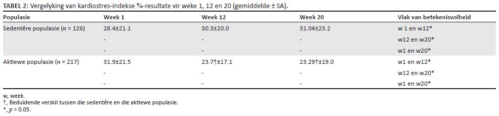 ’n Vergelyking van die KSI-lesings vir die basislyn (week 1) het geen noemenswaardige verskil tussen die twee groepe aangedui nie. Die resultate vir weke 12 en 20 het egter statisties beduidende verskille in die KSI-waardes van deelnemers uit die onderskeie populasies getoon. Die sistoliese en diastoliese BD-lesings, asook die BD tussen groepe, het ’n beduidende verskil (p = 0.001) tussen die twee proefpopulasies getoon. Die vergelyking van KSI-resultate binne-in die groep in Tabel 2 toon duidelik ’n aansienlike afname in die gemiddelde KSI-persentasie van die aktiewe populasie vanaf week 1 tot week 20, terwyl daar gedurende dieselfde tydperk ’n beduidende toename in die sedentêre bevolking se KSI was. Tabel 3 toon dat ooreenstemmende resultate verstaan kon word toe die gemiddelde HT van die twee populasies vergelyk is, met ’n beduidende daling in die aktiewe populasie se gemiddelde HT en ’n geringe toename in dié van die sedentêre populasie.