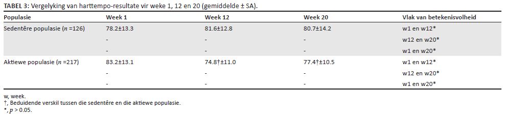 TABEL 3: Vergelyking van harttempo-resultate vir weke 1, 12 en 20 (gemiddelde ± SA).