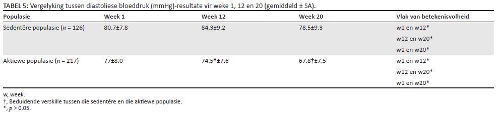 Wanneer sistolies BD vergelyk word (Tabel 4), sien ons ’n geleidelike daling in die resultate van die aktiewe populasie vanaf week 1 tot week 2, terwyl dié vir die sedentêre populasie gedurende week 12 ’n hoogtepunt bereik het. Sistoliese BD (Tabel 4) het beduidend gedaal in die aktiewe populasie vanaf weke 1 tot 20. Diastoliese BD (Tabel 5) het in albei populasies ’n daling getoon, maar in ’n groter mate in die aktiewe populasie.