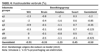 Die effek wat ’n 35%-verhoging in die prys van elektrisiteit op die totale algemene verbruik van huishoudings sal hê, word in Tabel 4 geïllustreer. Dit onderskei ook tussen huishoudings van die verskillende inkomstegroepe (q1-q4), woongebiede (d9-d10) en rasse. Die tabel dui slegs die strata aan waar daar noemenswaardige veranderinge voorgekom het en/of wat vir hierdie artikel van belang is. Die uitwerking word as ’n persentasie in die tabel aangedui. Tabel 4 toon aan dat ’n styging in die prys van elektrisiteit Asiate in Suid-Afrika die meeste sal benadeel. Indien die prys van elektrisiteit met 35% styg sal algemene verbruik onder Asiate met 1.23% per jaar daal. Volgens die studie deur Cameron en Naudé (2008) onderneem, sou sodanige prysstyging wit mense in daardie stadium die meeste benadeel het. Die afgelope paar jaar het omstandighede egter verander. Die navorsers reken dat die verandering moontlik kan wees vanweë die gebruik van ’n nuwe databasis en die ekonomiese krisis, wat die wêreld gedurende 2007−2008 getref het. Volgens Tabel 4 sal verbruik in die gebiede waar die meeste wit mense woonagtig is (d9 en d10) nie noemenswaardig deur die prysstyging beïnvloed word nie. Die rede is waarskynlik dat dié groepe oor alternatiewe energiebronne beskik en daarom onelasties (ofte wel ‘ongevoelig’) vir prysstygings in elektrisiteit is. Hierdie prysstygings is moontlik te klein om hul vlakke van verbruik merkbaar te beïnvloed. ’n Diepgaande begrip van die invloed wat prysstygings op huishoudings het, kan moontlik na vore tree indien die onderliggende sosiaal rekenkundige matriks (SAM), wat die algemene ewewigsmodellering onderlê, dieper ontleed word, maar dit is nie die oogmerk van ons studie nie.