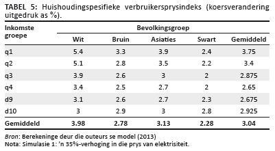 Die verspreidingseffek wat ’n 35%-verhoging in die verbruikersprys van elektrisiteit op die spesifieke inflasiekoers van huishoudings sal hê, word in Tabel 5 opgesom. Die tabel toon die invloed wat die prysverhoging op die onderskeie inkomstegroepe, rassegroepe en woongebiede in terme van huishouding spesifieke verbruikersprysindekse (inflasie) sal hê. Inflasie is die gemiddelde volgehoue toename in al die pryse in die ekonomie oor die periode van ’n jaar gemeet (met ander woorde die koers van verandering). Die normale inflasiekoers, soos aangetoon in Tabel 1, dek die gemiddelde mandjie van almal in die land gesamentlik. Dié mandjie neem meer as 2000 items in ag wat mense normaalweg aankoop, en bepaal dan met hoeveel die prys daarvan gemiddeld jaarliks toeneem (Mankiw 2014:476). Die goedere en dienste waarop verskillende groepe mense hul inkomste spandeer, verskil egter. Arm mense koop byvoorbeeld meer noodsaaklike lewensmiddele, terwyl meer gegoede gemeenskappe meer luukshede aankoop. Omdat die prys van verskillende produkte nie teen dieselfde tempo toeneem nie, sal die mandjie goedere wat armes aankoop, verskil van wat die meer gegoede deel van die gemeenskap koop. Elke groep ervaar prysstygings anders, omdat die totale pakket van verbruikersgoedere wat elke huishouding aankoop, verskil en daarom ervaar elke inkomstegroep ook verskillende inflasiekoerse (Mohr 2014:128). Onder die groep met die laagste inkomste (q1) in Tabel 5 sal ’n verhoging van 35% in die prys van elektrisiteit tot ’n styging van 3.75% in hul inflasiekoers lei. Dit beteken dat vir hierdie spesifieke inkomste groep die pryse van hul aankope gemiddeld met 3.75% sal styg. Tabel 5 toon verder ook aan dat in hierdie heel armste groep (q1), wit mense ’n gemiddelde prysstyging van 5.4% sal ondervind, terwyl die pryse van swart mense se aankope slegs met gemiddeld 2.4% sal toeneem. In al die groepe gesamentlik sal wit mense egter ’n gemiddelde prystoename van 3.98% ervaar, in vergelyking met die 3.04% van swart mense. Dit impliseer dat indien die huishouding spesifieke verbruikersprysindeks in ag geneem word, die verbruik onder wit mense die nadeligste geraak sal word