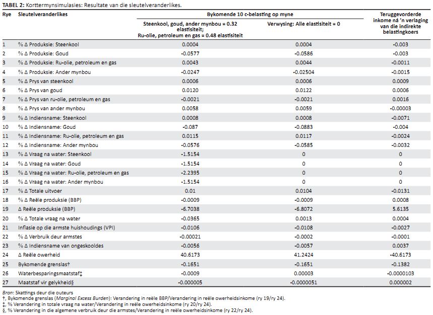 Ondervinding met algemene ewewigsanalise het geleer dat dit ten minste twee jaar duur vir impulse om volledig deur die land se ekonomiese stelsel te werk (Volkwyn & Kleynhans, 2014:5). Vir die doel van hierdie studie is twee jaar daarom as ‘’n kort termyn’ aanvaar. Die verskillende veranderlikes is telkens in terme van veranderinge in owerheidsinkome uitgedruk. Die uitkomste van verskillende beleidscenario’s kon gevolglik in terme van bykomende belastinginkome vergelyk word.Die relevante veranderlikes wat ’n invloed op die verbruik van water, reële inkome en produksie in Suid-Afrika het, en die algemene vlak van verbruik deur die armes, word in Tabel 2 aangetoon (uitgedruk as persentasies). Dit stel die navorsers in staat om te bepaal wat die invloed van bykomende belasting op die onderskeie mynbousektore en die land as geheel behoort te wees. Die resultate in Tabel 2 toon aan dat totale mynbouproduksie op die kort termyn (rye 1 tot 4 gesamentlik) sowat 0.0194% sal daal, indien ’n bykomende belasting op waterverbruik van 10 sent per kubieke meter gehef sal word. Die prys van mynbouprodukte sal terselfdertyd 0.0041% styg wat die land op hierdie gebied ekonomies minder mededingend sal maak, maar tog het die model daarop gewys dat indien die hele ekonomie in ag geneem word, soos wat algemene ewewigsmodellering doen, dan behoort uitvoere wel steeds met 0.01% toe te neem. Die prys van steenkool sal effens styg, wat die armes moontlik kan benadeel, maar die brandstofprys sal met 0.0021% daal. Hierdie syfers kan miskien gering lyk, maar onthou dat dit van toepassing is op die hele land se produksie en totale arbeidsmag, wat uiteindelik wel aansienlike getalle toon. Saam met die daling in produksie deur myne sal indiensname gevolglik ook afneem. In totaal sal werksgeleenthede by myne op die kort termyn met 0.0331% daal. By steenkool en die petroleumbedryf sal dit egter effens toeneem. Reële produksie en totale inkome van alle landsburgers (BBP) sal wel effens daal, maar via indirek teruggevorderde inkome deur die owerheid balanseer. Myne se gemiddelde vraag na water sal met 1.7% afneem, wat die doel van die voorgestelde belasting is. Tabel 2 toon aan dat ’n bykomende belastingheffing ’n negatiewe las op die myne sal plaas. Fullerton (1987:2) definieer die bykomende grenslas (BGL) as die land se reële inkome (BBP) relatief tot die reële toename in owerheidsinkome. Die BGL is hier negatief, terwyl die besparing van water per eenheid groter is (ry 26) en die heel armste huishoudings bevoordeel word wat hul algemene verbruik betref (sien ry 27). Hierdie resultate is besonder positief, aangesien dit die land se totale inkome (BBP) minder benadeel en die armes bevoordeel. Die invloed wat hierdie bykomende belasting op mynbouproduksie en pryse sal hê (rye 1–8) is uiteenlopend; sommige is positief en ander nie. Die meeste myne gebruik nie oormatig baie water tydens hul produksieprosesse nie, alhoewel Tabel 2 aantoon dat dit relatief gesproke is. Die gevolgtrekking is dat bykomende belasting nie ’n baie groot impak op die produksie van myne sal hê nie en dit die prys van hul produkte nie noemenswaardig sal verhoog en hul mededingendheid benadeel nie.