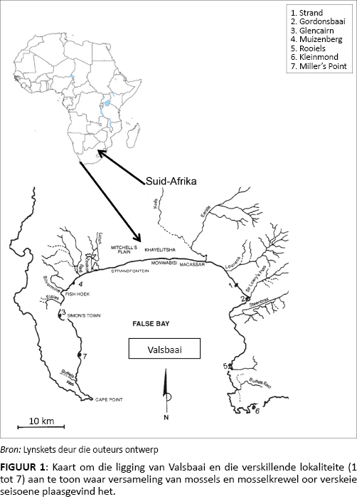 Valsbaai is geleë by 34˚15`S, 18˚40`O aan die suidpunt van Afrika (Figuur 1) en is die grootste egte of natuurlike baai in Suid-Afrika (Heinecken, Bickerton & Heydon 1983). Vis en skulpvis word in die baai geoes deur kommersiële en bestaanvissers (Van der Merwe et al. 1991) en verskeie watersportsoorte word beoefen (Reinecke & Reinecke 2013; Taljaard et al. 2000). Verskeie pypleidings stort steeds stygende volumes riool, visafval of industriёle afval in die mariene omgewing. Die pypleidings en uitlatings is veral gekonsentreerd in die meer dig bewoonde sentrums langs die kus, maar ’n formele nasionale evaluering van die impak van hierdie uitlatings is nog nie gedoen nie (Griffiths et al. 2010). Sedimentmonsters is gedurende vier opeenvolgende seisoene tydens laagwater by lokaliteite versamel tussen Julie 2000 en Julie 2001 en in ’n vrieskas gestoor vir latere analise. Watermonsters is op ’n diepte van 30 cm net bokant die sediment versamel en daarna voorberei vir analise soos volledig uiteengesit in Reinecke et al. (2012). Die gegewens is volledig gedokumenteer en word nie weer herhaal nie en is slegs gebruik om vergelykings te tref tussen die vlakke in die twee gekose spesies.