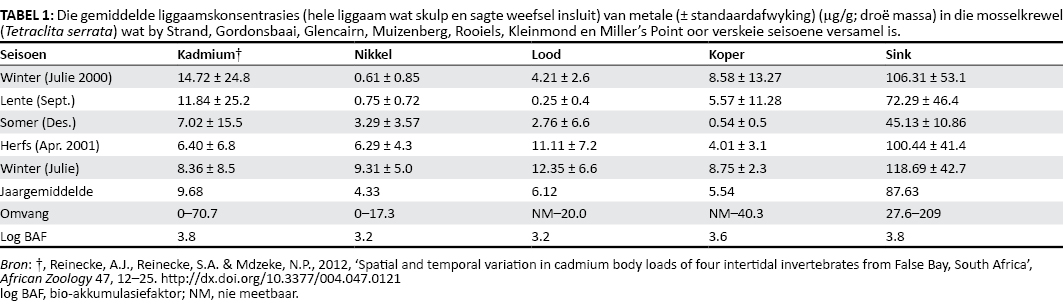 TABEL 1: Die gemiddelde liggaamskonsentrasies (hele liggaam wat skulp en sagte weefsel insluit) van metale (± standaardafwyking) (µg/g; droë massa) in die mosselkrewel (Tetraclita serrata) wat by Strand, Gordonsbaai, Glencairn, Muizenberg, Rooiels, Kleinmond en Miller’s Point oor verskeie seisoene versamel is.