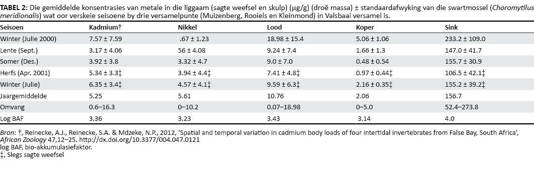 Die metaalkonsentrasies in die liggame (sagte weefsel en skulp) van die swartmossels (C. meridionalis) gedurende die verskillende seisoene word in Tabel 2 vergelyk. Die statistiese analise het aangetoon dat die konsentrasies Cu en Ni betekenisvol (p < 0.05) tussen alle seisoene verskil het met die hoogste konsentrasies gedurende die winter van 2000 gemeet. Die sagte weefsel se gemiddelde lading Ni was in die winter van 2001 ook betekenisvol hoër (p < 0.05, Mann-Whitney-toets) as tydens ander seisoene. Vir Pb is betekenisvolle (p < 0.05) verskille in die heelliggaamladings van die swartmossels gevind tussen die lente en winter van 2000, en ook tussen die somer en lente met winterkonsentrasies wat die hoogste was. Wat Zn betref, het die konsentrasies van beide die sagte weefsel en hele liggaam aansienlik gevarieer tussen seisoene en was dit meestal betekenisvol verskillend tussen seisoene, behalwe gedurende lente en somer. Ook in dié geval is die hoogste konsentrasies gedurende die winter gemeet. Wat Cd in die swartmossels betref, het die gegewens die toets vir normaliteit geslaag en het eenrigting-ANOVA geen statisties betekenisvolle verskille (p = 0.781) tussen seisoene aangetoon nie. Hierdie verskynsel is reeds voorheen vir Cd in die mosselkrewel aangetoon (Reinecke et al. 2012).