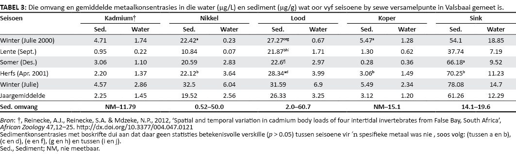 Alle berekenings is met die program Jandel Scientific Sigmastat 3.0 en Statsoft. 2010. Statistica (data-analise sagtewarestelsel) 9.0. gedoen. Metaalkonsentrasies in beide spesies is vir normaliteit getoets met die Kolmogorov-Smirnovtoets. Nieparametriese gegewens is getoets met die Kruskal-Wallis-analysis of variance (ANOVA) vir rangordes en daaropvolgend met die Dunn-toets en ook die Student-Newman-Keuls-metode. Die vlak van betekenisvolheid was p < 0.05 (sien ook Reinecke & Reinecke 2013).Na aanleiding van die bevindinge van Reinecke et al. (2012) m.b.t. omgewingsparameters soos reënval, pH en soutgehalte se moontlike invloed in Valsbaai, wat gelyklopend met hierdie studie versamel is, word die gegewens nie weer hier herhaal nie. Getabuleerde resultate van konsentrasies in ’n enkele omgewingsmonster is gebaseer op minstens vyf metings. Gemiddelde waardes per seisoen van konsentrasies is gebaseer op die getal lokaliteite waarin hulle versamel is. Jaarwaardes vir die baai as geheel per lokaliteit is gemiddeld vir alle seisoene (sien ook Reinecke & Reinecke 2013). Riglyne vir agtergrondkonsentrasies van sedimente (Department of Environmental Affairs and Tourism [DEAT] 1985) is reeds hewig gedebatteer in latere dokumente van dieselfde instelling. Reinecke en Reinecke (2013) wys daarop dat riglyne soos dié en andere (Fatoki & Mathabahta 2001; Maritz & Swanepoel 1998) baie arbitrêr is en dat basislynmodelle soos deur Newman en Watling (2007) voorgestel, ’n meer verantwoordbare basis bied om metaalverryking in sedimente teenoor basislyndata te beoordeel. Die mate waarin potensiële probleemmetale soos Cd en Pb vanuit die water in die organismes kan akkumuleer, is wel ondersoek deur middel van die biologiese akkumulasiefaktor (BAF), die metaal se konsentrasie in die diereliggaam (Cb) teenoor die konsentrasie in die wateromgewing (Cw) by ekwilibrium (op ’n massa-tot-massa-basis) en weergegee deur BAF = Cb/Cw en uitgedruk as ’n logaritme (sien ook Reinecke & Reinecke 2013).