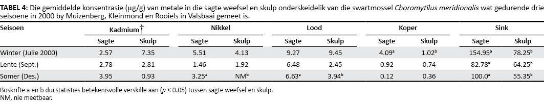 TABEL 4: Die gemiddelde konsentrasie (µg/g) van metale in die sagte weefsel en skulp onderskeidelik van die swartmossel Choromytilus meridionalis wat gedurende drie seisoene in 2000 by Muizenberg, Kleinmond en Rooiels in Valsbaai gemeet is.