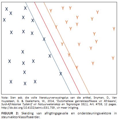 Die steunvektorklassifiseerder (SVM) is gebaseer op die minimering van strukturele risiko (Khan et al. 2010). Strukturelerisikominimering is ’n masjienleerbeginsel wat deur Vapnik (1995) soos volg verduidelik word: In masjienleer word ’n model saamgestel uit ’n eindigende datastel wat lei tot oormatige passing (d.i. die model word te spesifiek op die afrigtingstel gemodelleer en is nie meer algemeen genoeg om nuwe data te klassifiseer nie). Strukturelerisikominimering minimeer die probleem van oormatige aanpassing deur die model se pasgemaakte kompleksiteit te balanseer met die model se vermoë om veralgemenings te hanteer.Die hoofidee agter die benadering is om ’n hipotese te vind wat die laagste werklike fout waarborg, dit is die beste skeiding bepaal tussen die verskillende klasse van die klassifikasieprobleem. Die SVM bepaal dan ’n vlak in die ruimte wat die punte van die negatiewe en positiewe voorbeelde die beste verdeel deur ’n liniêre skeiding te maak. Hierdie vlak word die besluitnemingsvlak genoem. Die onbekende teks word ook in dié n-dimensionele ruimte voorgestel, en afhangend van die posisie van die onbekende tekste teenoor die besluitnemingsvlak, in die positiewe of negatiewe voorbeelde, word die klassifikasie bepaal. ’n Groot beperking van SVM’s is dat so ’n klassifiseerder slegs ’n binêre klassifikasieprobleem kan hanteer. In ’n geval waar daar meer as twee klasse is waartussen die klassifiseerder moet onderskei, sal elke klas met elke ander klas vergelyk moet word, en aan die hand van ’n gewigtoekenningskema moet die beste klas vir die klassifikasie gekies word. Dit kan ’n geweldige toename tot gevolg hê in die aantal klassifiseerders wat uiteindelik in ’n multiklasomgewing gebruik word om ’n bepaalde klas aan ’n teks toe te ken. Dié toename in kompleksiteit veroorsaak ’n toename in die gebruik van fisieke geheue en verwerkingskrag. Die afrigtingsfase en klassifikasie neem ook derhalwe langer. Verder word daar verwarring opgemerk tydens klassifikasie, omdat ’n klomp verskillende klasse aan die teks toegeken word met elke iterasie van vereenduidiging tussen die klasse. Figuur 2 toon die skeiding tussen die positiewe en negatiewe afrigtingsgevalle saam met die ondersteuningsvektore.