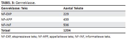 Wachsmuth en Bunja (2011) redeneer dat die funksies (intensies) van tekste konstante eienskappe van genre bied om dit mee te analiseer. Hulle definieer dan drie diskrete klasse wat die funksie van ’n teks kan beskryf: ekspressiewe teks (NF-EXP – waarvan die funksie van die teks nie kommersieël is nie en waar ’n persoonlike mening weergegee word), appellatiewe teks (NF-APP – die teks het ’n kommersiële funksie, soos om die leser te oortuig om ’n produk te koop) en informatiewe teks (NF-INF – inligting wat nie kommersieël georiënteer is nie, maar wat inligting op ’n joernalistieke wyse weergee). Hierdie drie klasse is dan handmatig aan die afrigtingtekste toegeken en gebruik in teksklassifikasie-eksperimente wat goeie resultate aangetoon het. Dié klasse van Wachsmuth en Bunja (2011) word gebruik in hierdie studie as die genreklasse waartussen die klassifiseerder moet kan differensieer. Die onderstaande tabel toon die uiteindelike getal afrigtingsgevalle wat vir elke klas gebruik word.