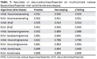 TABEL 7: Resultate vir steunvektorklassifiseerder en multinomiale naïewe Bayes-klassifiseerder met verskillende eienskappe.