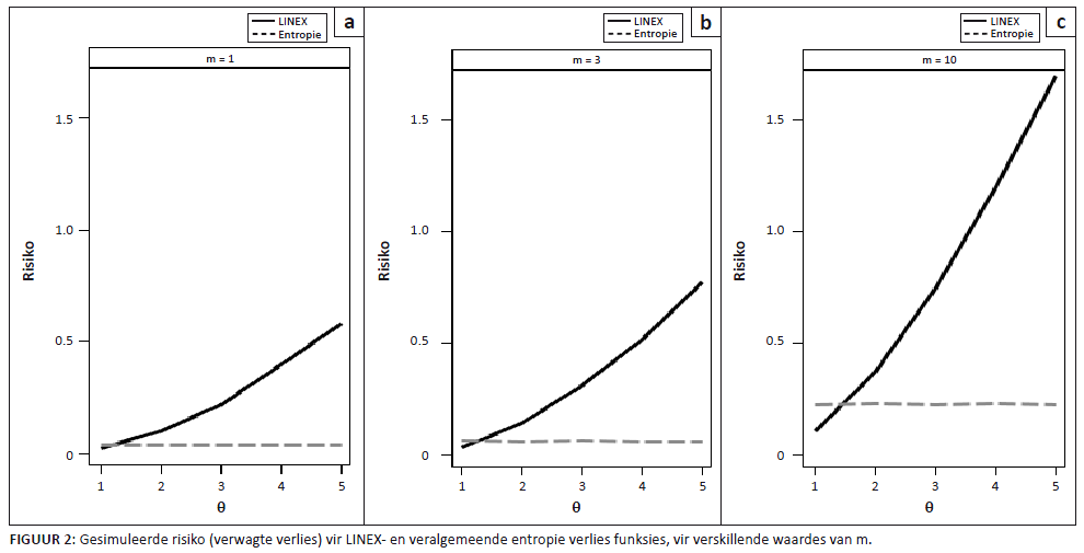 Die wenslike keuse van ’n verliesfunksie is die funksie wat minimum risiko ten toon stel. Uit die gesimuleerde resultate blyk dit dat, wat die negatiewe parameterkeuses van die Al-Bayyati verliesfunksie (c < 0) betref, dié funksie beter vaar in teenstelling met die kwadratiese verliesfunksie (sien Figuur 1), ongeag die keuse van die a priori-verdeling (gemeet deur minimum risiko). In die LINEX- en veralgemeende entropie-verliesfunksie het dit geblyk dat die entropie-verliesfunksie konstante risiko toon in teenstelling met die LINEX-verliesfunksie wat ’n niedalende risikofunksie getoon het. Met betrekking tot die LINEX-verliesfunksie is die risiko van die veralgemeende entropie-verliesfunksie baie klein. Soos voorheen, is dit ook nie beïnvloed deur keuse van die
