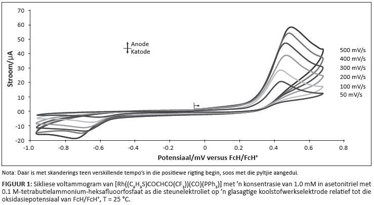 FIGUUR 1: Sikliese voltammogram van [Rh((C4H3S)COCHCO(CF3))(CO)(PPh3)] met ’n konsentrasie van 1.0 mM in asetonitriel met