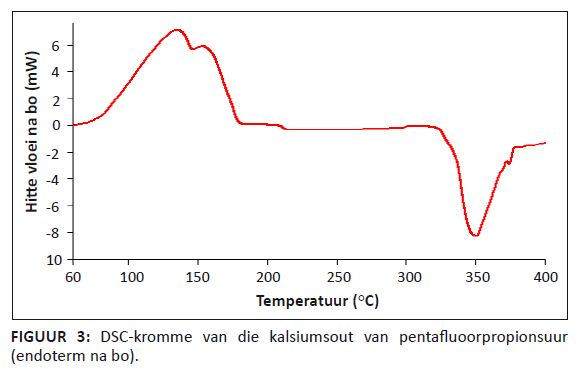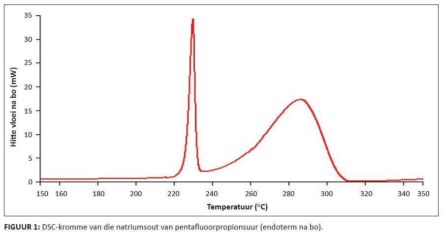 Volgens die patent deur Hals et al. (1954) is die natriumsout se dissosiasie van pentafluoorpropionsuur ’n eksotermiese reaksie. Figuur 1 toon die DSC-kromme vir die natriumsout van pentafluoorpropionsuur. Die eerste piek wat waargeneem word, verteenwoordig die smelting van die natriumsout, terwyl die tweede piek die dissosiasie verteenwoordig. Die dissosiasie van hierdie monster van die natriumsout is endotermies, wat ’n moontlike hidroksiedkontaminasie kan voorstel. Figuur 2 toon die DSC-verhittingskromme van die kaliumsout. Hierdie kromme toon dat die kaliumsout twee smeltingspunte het. Die duik wat na die tweede piek verskyn, toon dat die dissosiasiereaksie van die kaliumsout wel ’n eksotermiese reaksie is.Figuur 3 toon die DSC-kromme vir die kalsiumsout van pentafluoorpropionsuur. Die eerste piek asook die skouer is die gevolg van ongereageerde pentafluoorpropionsuur en water wat in die monster teenwoordig is. TGA-FTIR-analise toon dat TFE saam met koolstofdioksied by die dissosiasietemperature van die natrium- en kaliumsout van pentafluoorpropionsuur gevorm word. Die TGA-FTIR-analise van die kalsiumsout toon pieke vir sowel TFE as CO2, maar bevat ook pieke wat moontlik HFP kan voorstel.
