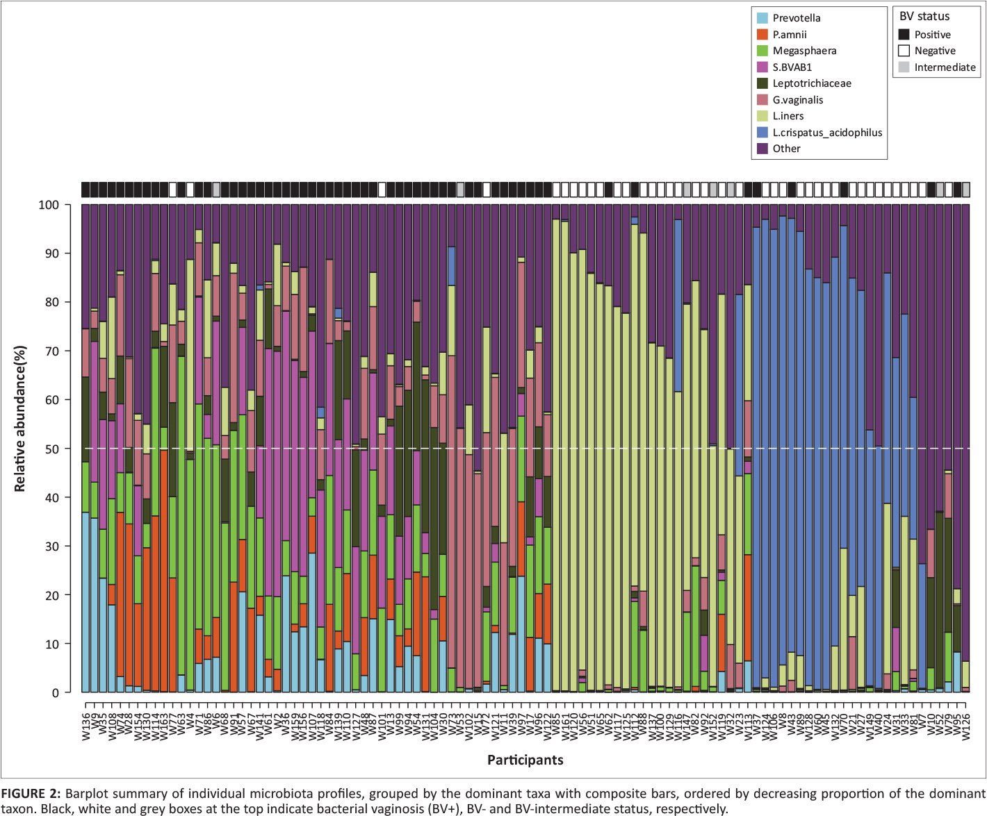 FIGURE 2: Barplot summary of individual microbiota profiles, grouped by the dominant taxa with composite bars, ordered by decreasing proportion of the dominant taxon. Black, white and grey boxes at the top indicate bacterial vaginosis (BV+), BV- and BV-intermediate status, respectively. |
