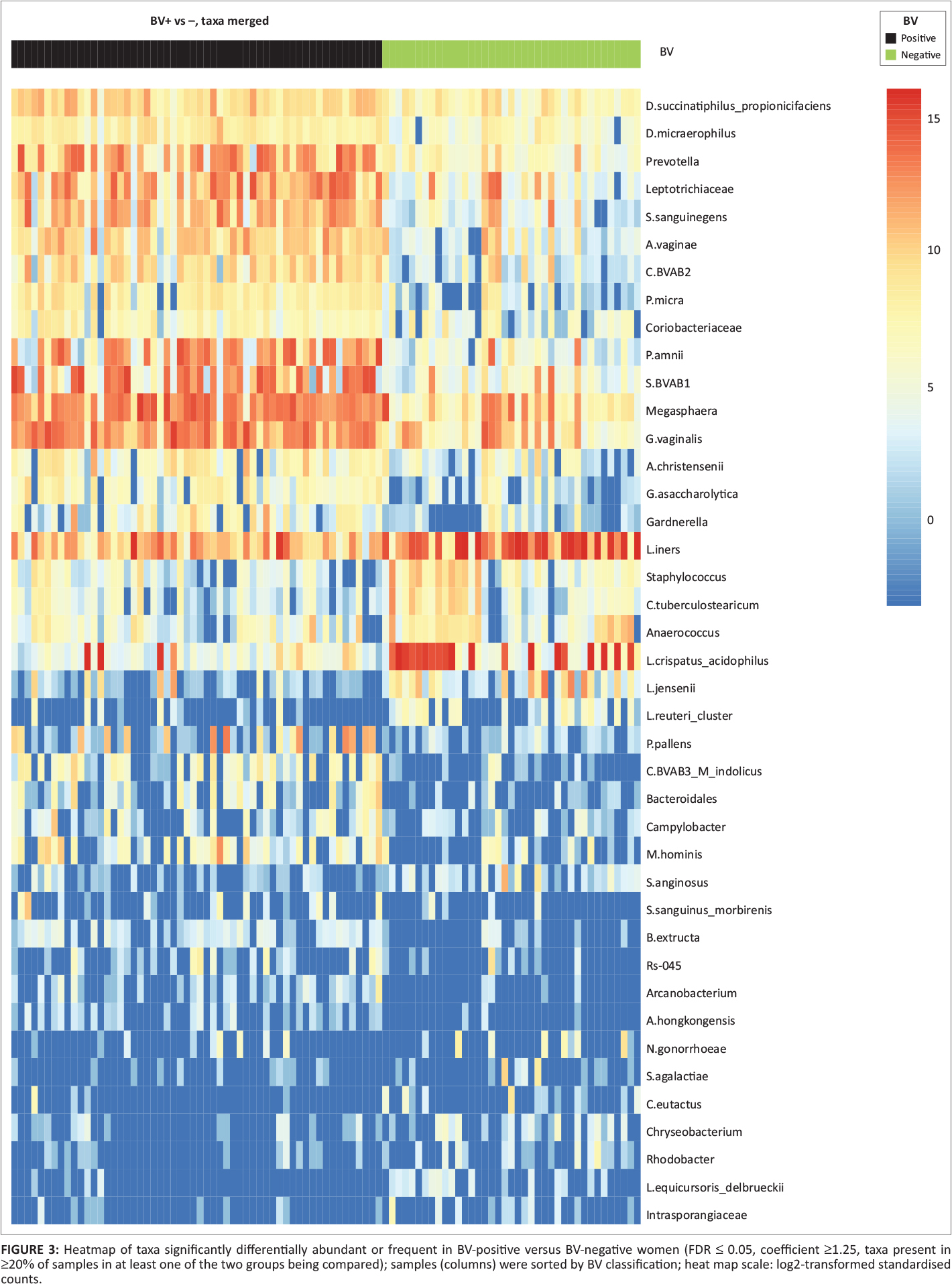 FIGURE 3: Heatmap of taxa significantly differentially abundant or frequent in BV-positive versus BV-negative women (FDR ≤ 0.05, coefficient ≥1.25, taxa present in ≥20% of samples in at least one of the two groups being compared); samples (columns) were sorted by BV classification; heat map scale: log2-transformed standardised counts. |