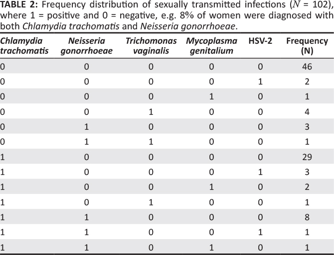 | TABLE 2: Frequency distribution of sexually transmitted infections (N = 102), where 1 = positive and 0 = negative, e.g. 8% of women were diagnosed with both Chlamydia trachomatis and Neisseria gonorrhoeae. |